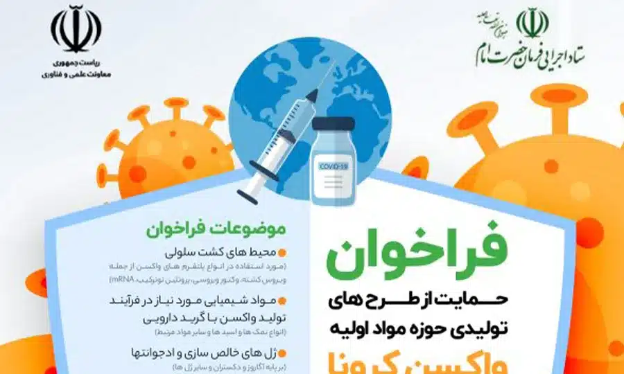 در حال حاضر به دلیل شدت نیاز به این واکسن ها، مواد اولیه مورد نیاز در فرآیندهای تولید نیز کاملا در دنیا کمیاب شده است؛ به نحوی که برخی از ساده ترین مواد اولیه مورد نیاز نیز صف های خرید بعضا ۶ ماهه را پیش روی خود می بینند. مشکلات ناشی از تحریم های ناجوانمردانه، انتقال پول و مسائل لجستیکی مربوط به واردات مواد به کشور را نیز می بایست به این شرایط اضافه نمود. در همین راستا معاونت علمی و فناوری ریاست جمهوری و ستاد اجرایی فرمان حضرت امام رحمت الله علیه به عنوان دو مجموعه پیشرو در شکل دهی به اکوسیستم توسعه فناوری در کشور، اقدام به سرمایه گذاری و حمایت از طرح های مواد اولیه واکسن کرونا با استفاده از ظرفیت داخلی نموده اند. شرکت های توانمند در زمینه تولید محیط های کشت، مواد معدنی با گرید دارویی مورد نیاز در فرآیندهای تولید واکسن، ژل های تخلیص و ادجوانت های فرمولاسیون و همچنین مواد پلی استایرنی مورد نیاز در کشت های سلولی می توانند در این فراخوان شرکت نموده و ضمن تلاش برای تامین نیاز کشور به مواد اولیه، از حمایت های لازم برخوردار گردند.